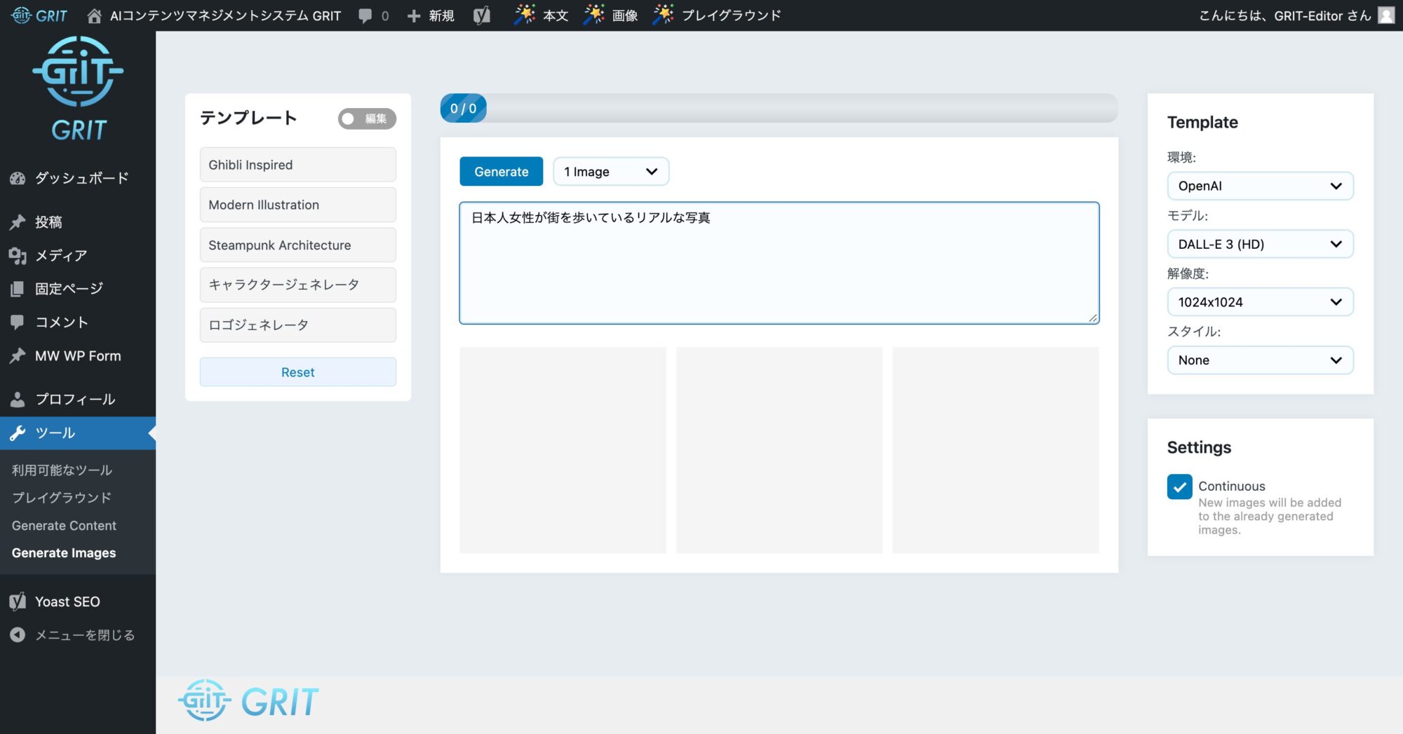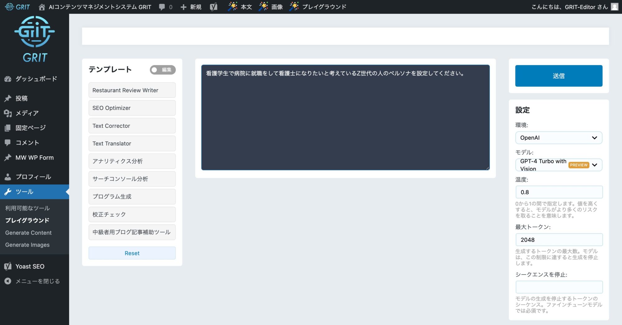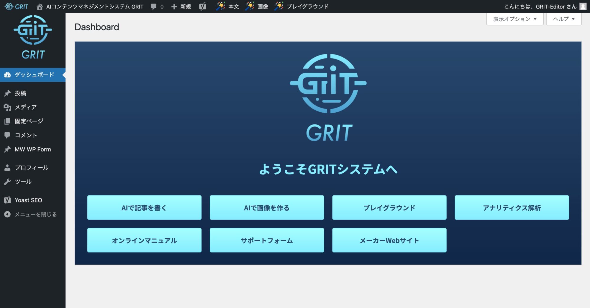 GRITの管理画面からダッシュボードを開き、「プレイグラウンド」をクリックします。
