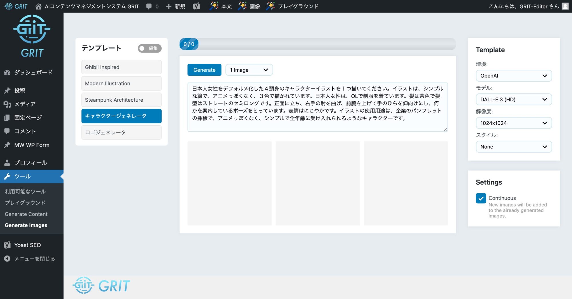 テンプレートから「キャラクタージェネレータ」を選択し、青枠内にキーワードを入力します。