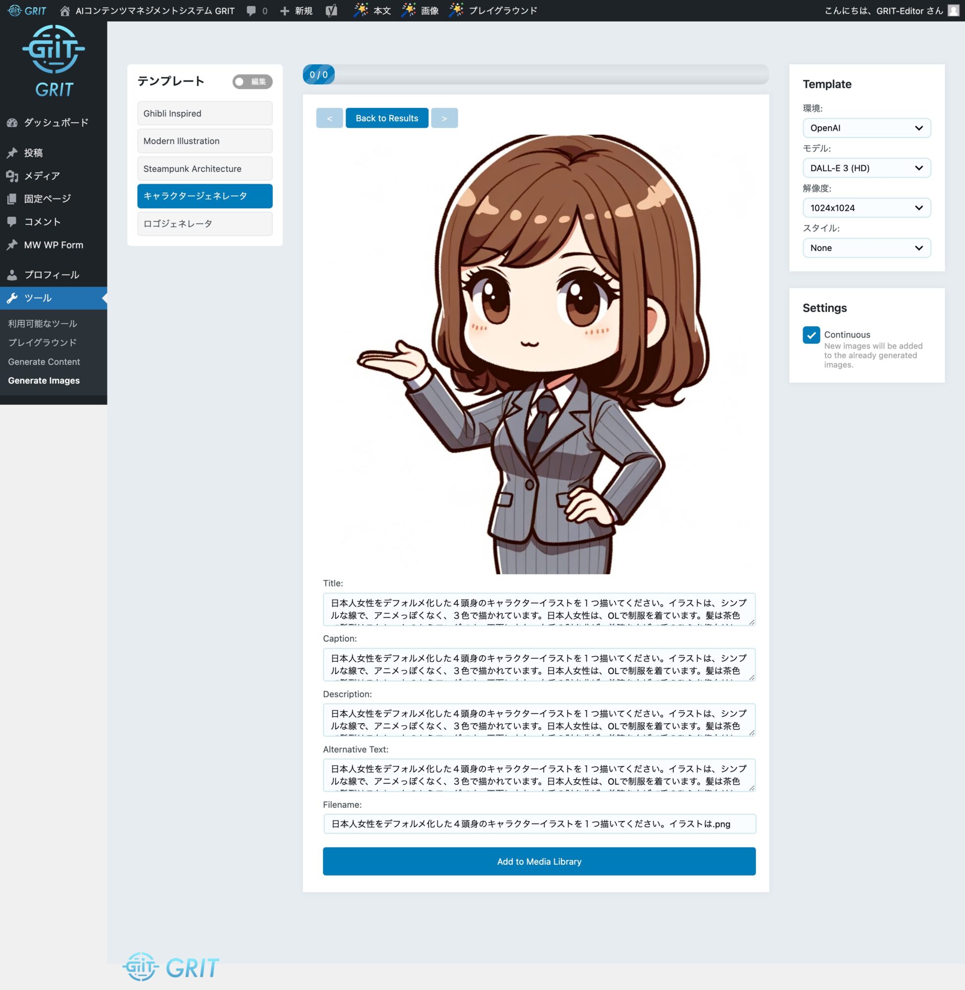 「Add to Media Library」をクリックするとメディアに画像が保存されます。