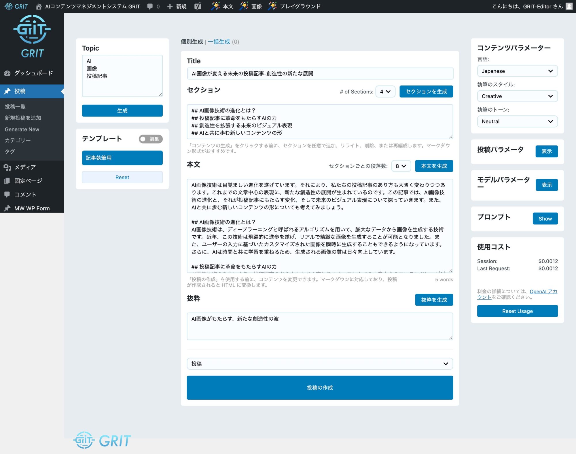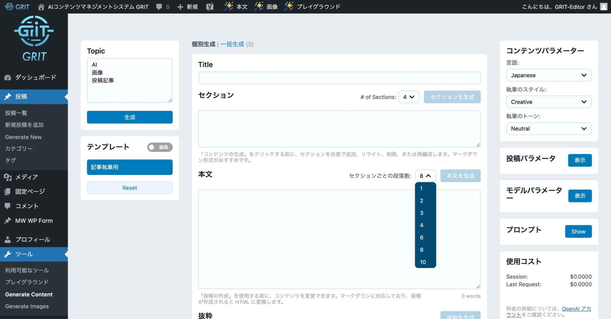 コンテンツパラメータ内で執筆のトーンなどを選択できます。