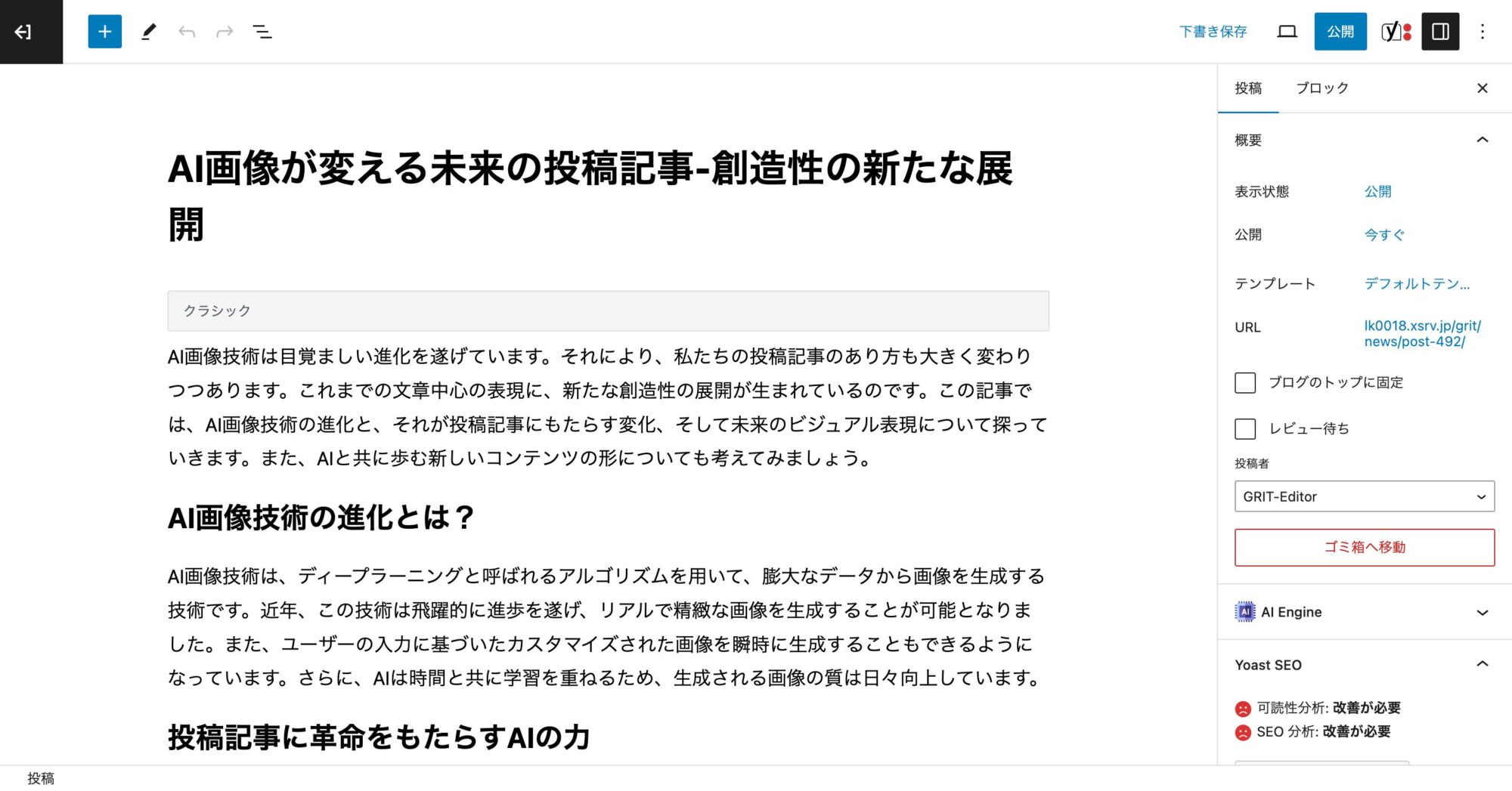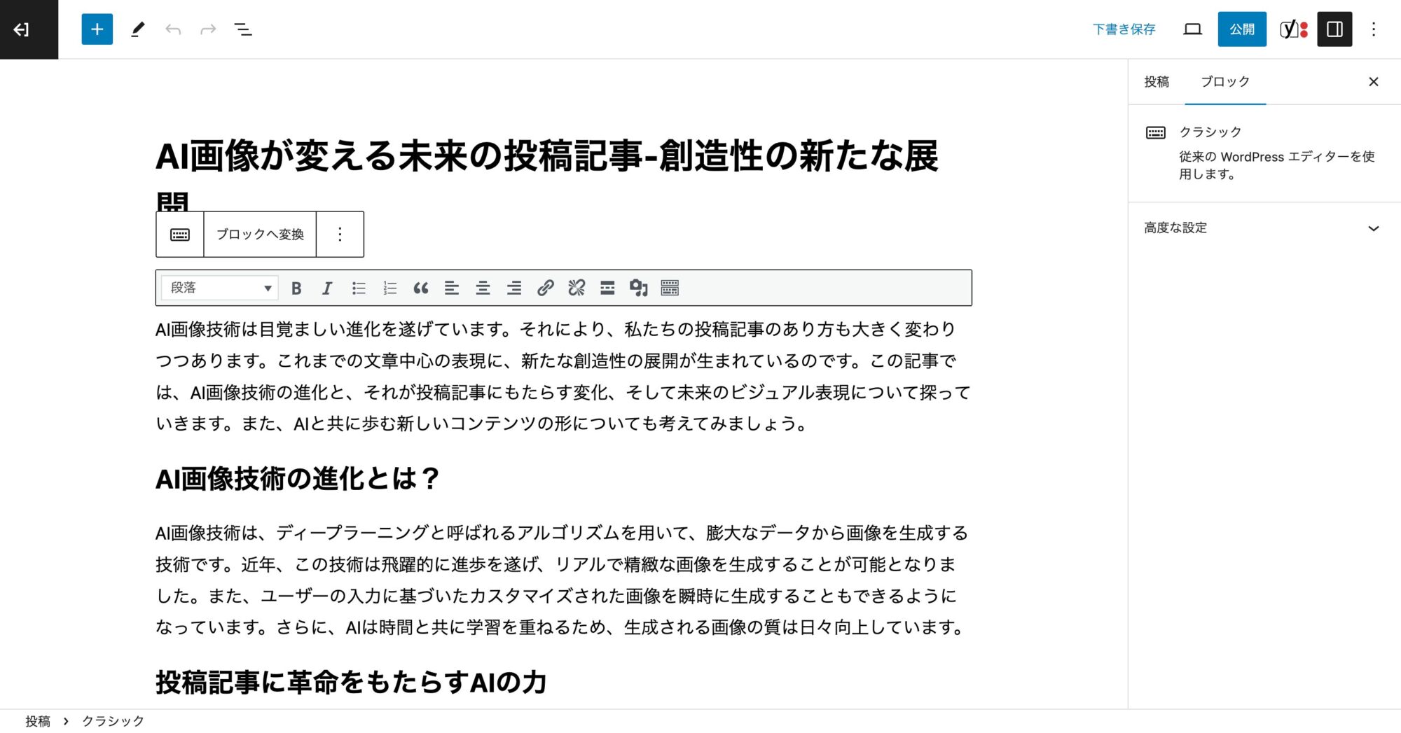 そのままの状態でも投稿は可能ですが、「クラシック」と書かれたエリアをクリックすることで通常の記事作成ページに変換されます(ブロックエディターに変換)。
