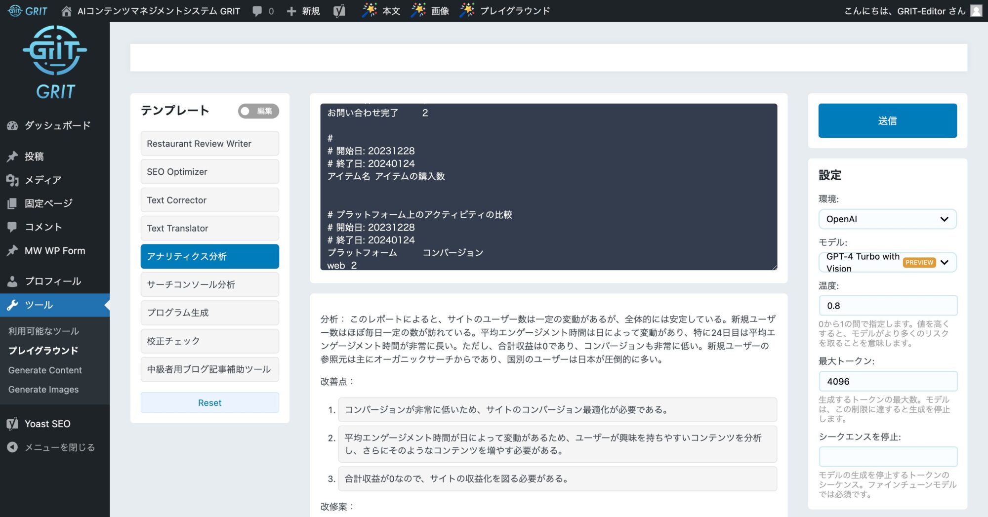 アナリティクス分析は、プレイグラウンド機能を使って行います。また、アナリティクス分析には、Googleアナリティクスのレポートデータが必要になります。こちらはアナリティクスに登録していない方は利用することができません。
