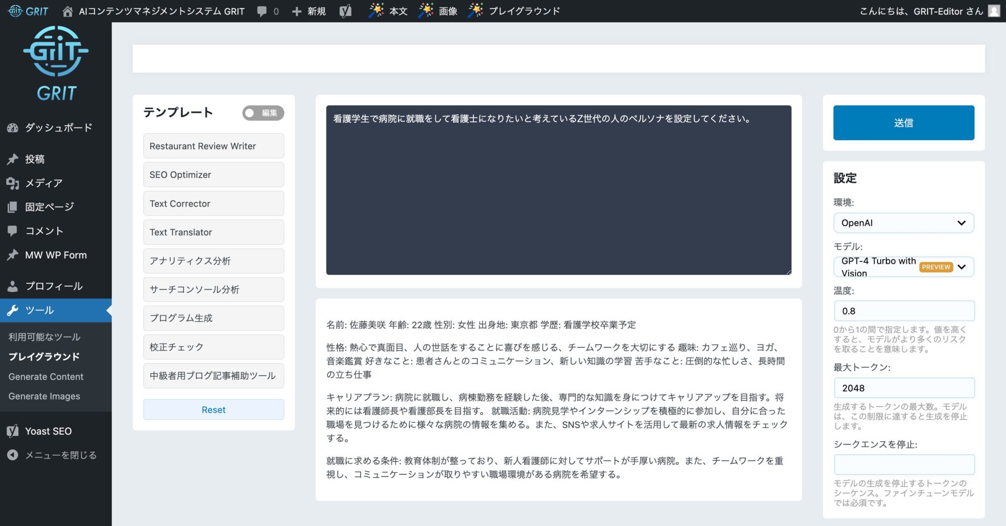 しばらく時間が経つと、キーワードに基づいた内容が下に表示されます。こちらでは看護学生の性格やキャリアプラン、就職に求める条件などが作られました。