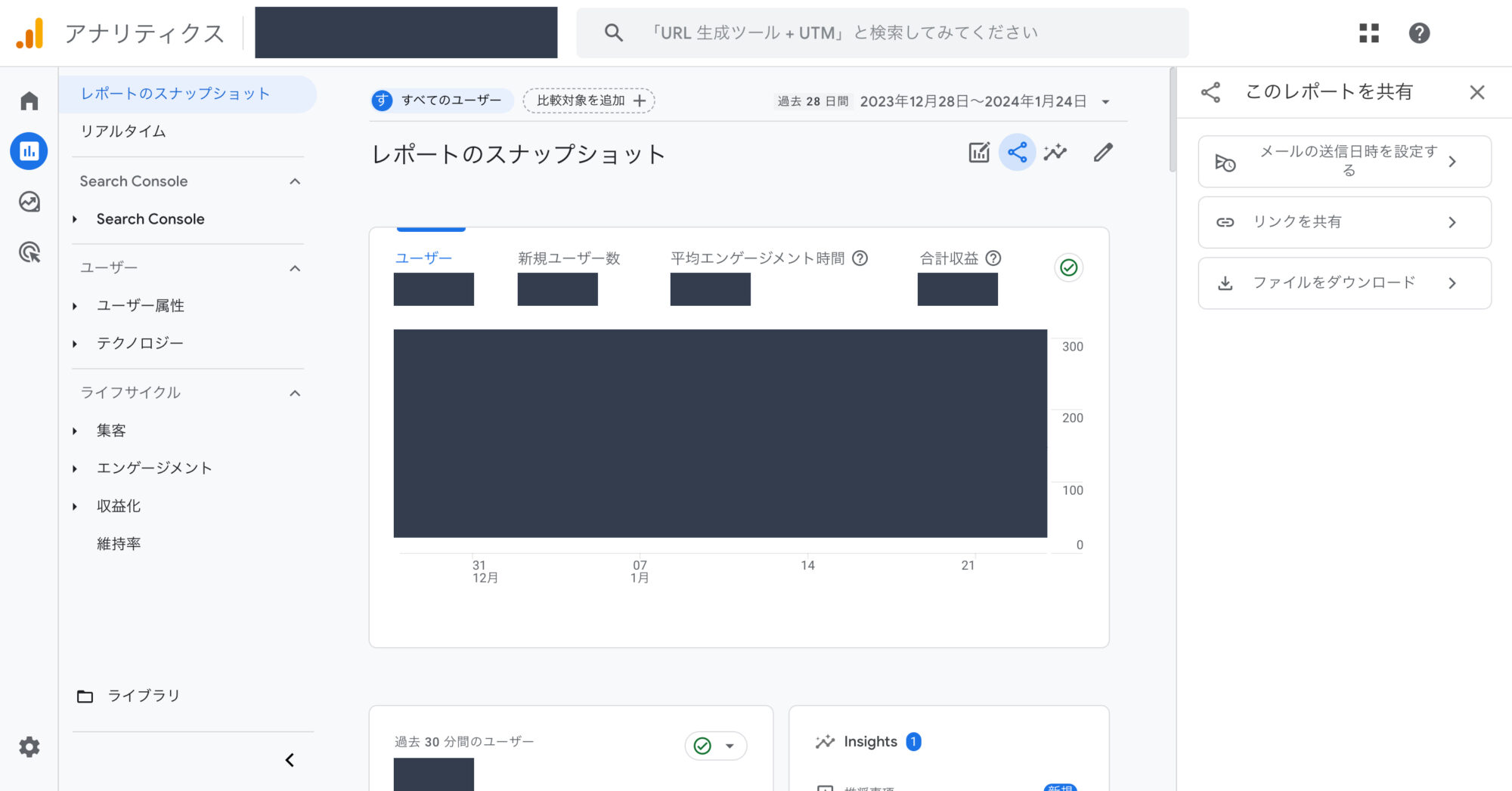 アナリティクスの管理画面からレポートを開き、右上のアイコン(このレポートの共有)をクリックし、ファイルをダウンロードをクリックします。